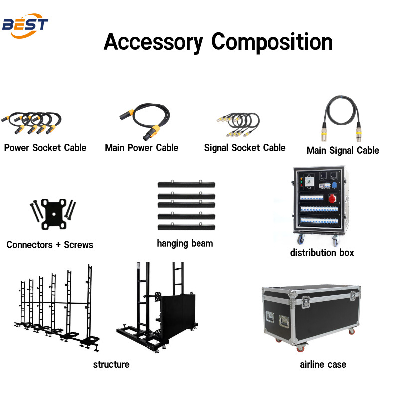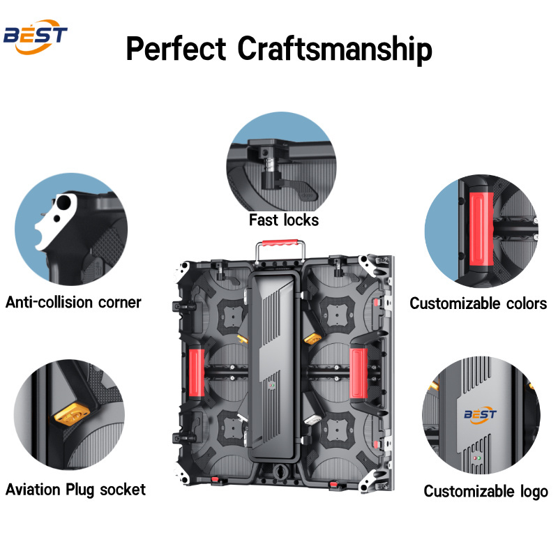 10-Sekunden-Modulmontage: Ultraleichte Aluminiumdruckgussplatten (500 × 500 mm) mit Schnellverschlüssen ermöglichen den schnellen Einsatz von Miet-LED-Bildschirmen – eine Person kann in 30 Minuten eine 4K-Wand bauen.